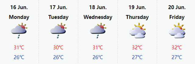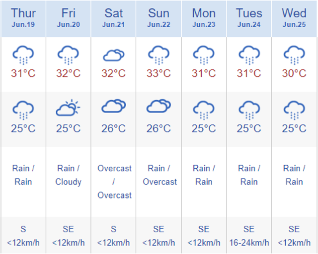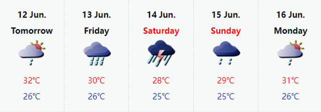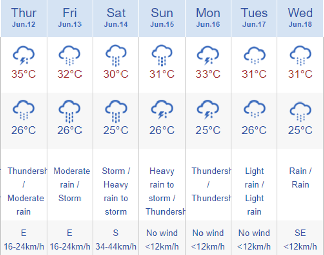 From June 13 to 15, widespread heavy rainfall is expected, with localized torrential downpours. Offshore winds will strengthen as the typhoon approaches.