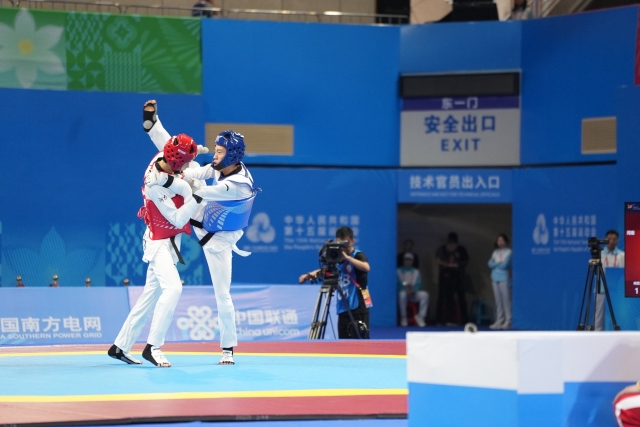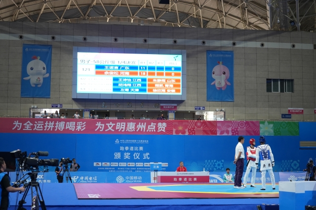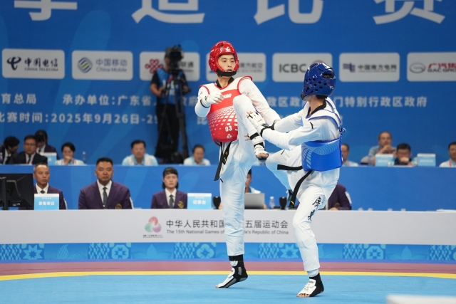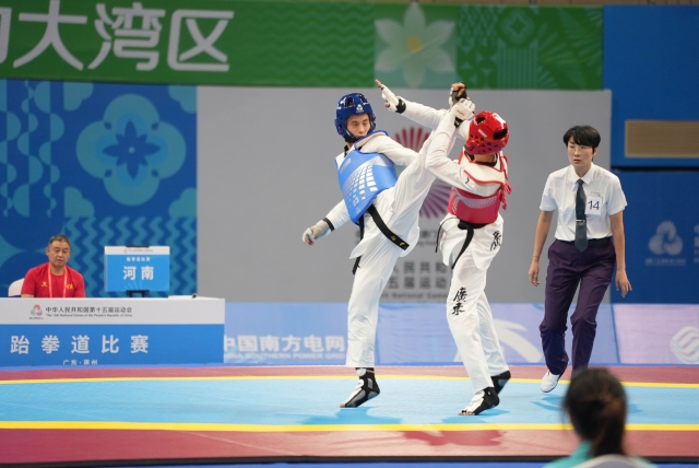 The Taekwondo competition of the 15th National Games commenced on September 26 in Huizhou City, Guangdong Province. Athlete Huang Kefen from the Guangdong team secured the first gold medal awarded in the Taekwondo event of the 15th National Games by winning the men's -58kg category.