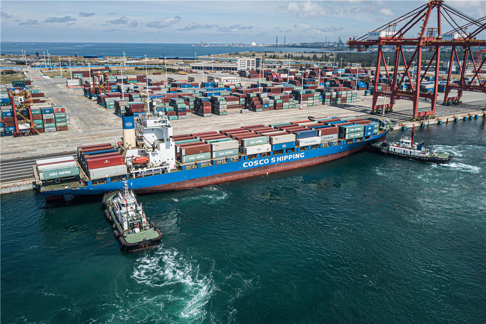 一艘中远海运集装箱货轮在两艘拖轮的辅助下,靠泊进海南洋浦小铲滩码头(9月23日摄,无人机照片)。新华社记者 蒲晓旭 摄