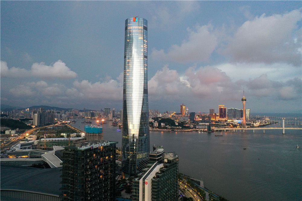 珠海中心大厦和远处的澳门(9月13日摄,无人机照片)。 新华社记者 陈晔华 摄