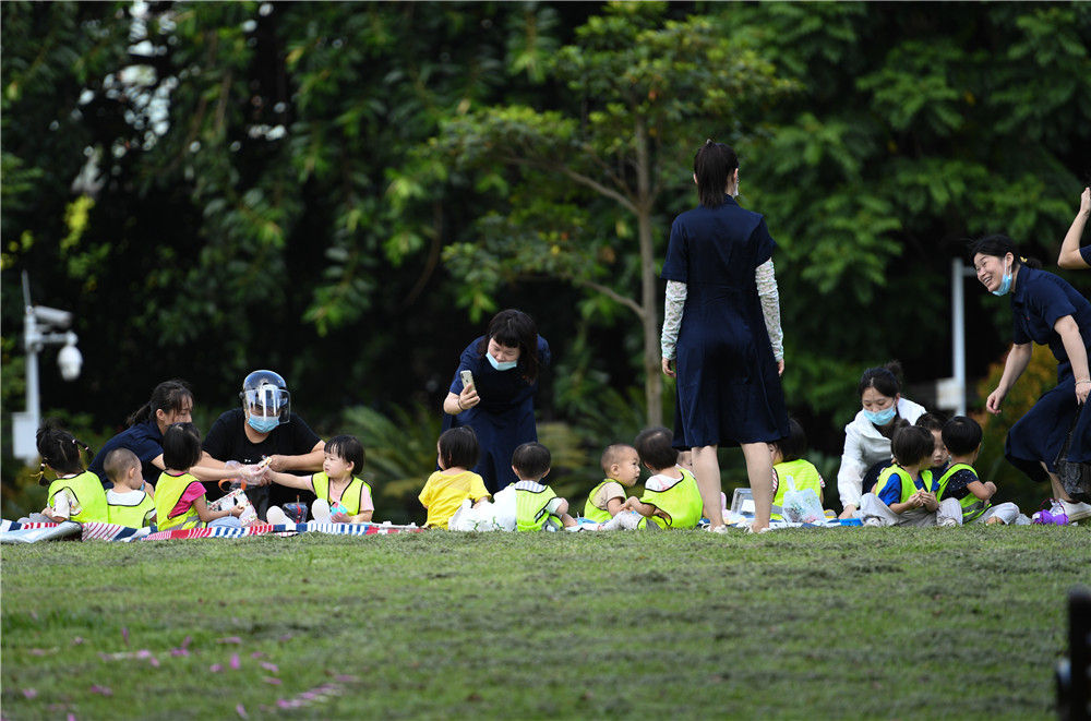 老师带着孩子在深圳福田区的荔枝公园玩耍(9月22日摄)。 新华社记者 毛思倩 摄
