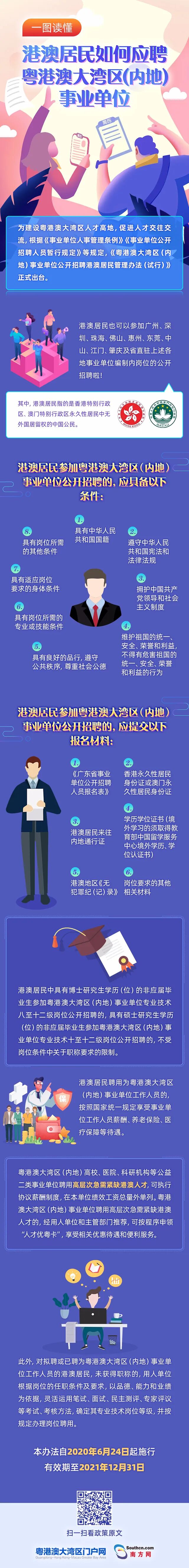 记者从广东省人力资源和社会保障厅获悉,为建设粤港澳大湾区人才高地,促进人才交往交流,为港澳青年提供更多就业机会和更好工作条件,该厅出台了《粤港澳大湾区(内地)事业单位公开招聘港澳居民管理办法(试行)》(以下简称“《办法》”)。从即日起,港澳居民也可以参加广州、深圳、珠海、佛山、惠州、东莞、中山、江门、肇庆及省直驻上述各地事业单位编制内岗位的公开招聘。